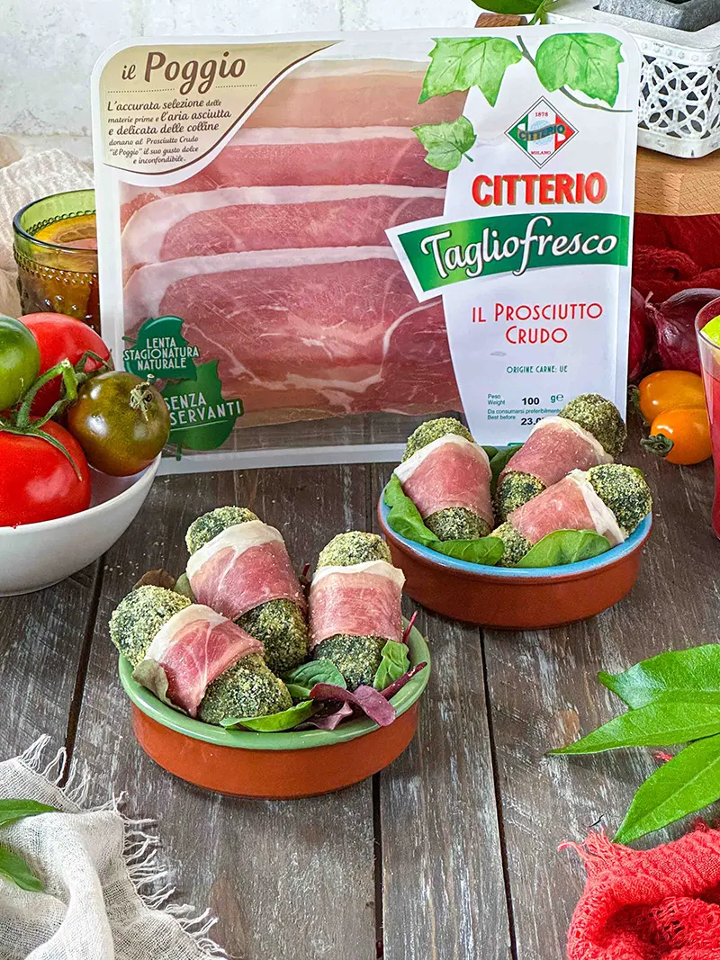 Crocchette di ceci con spinaci e bardatura di Prosciutto Crudo