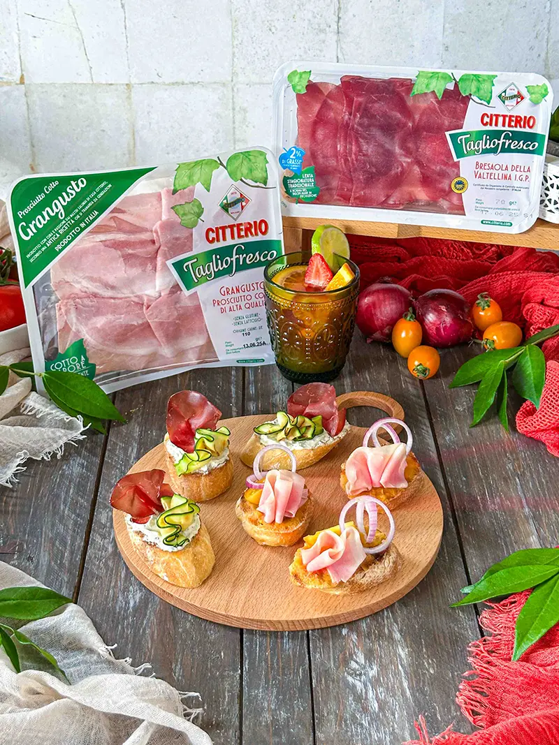 Per queste creazioni, Citterio ha scelto di valorizzare alcuni tra i suoi prodotti più iconici: l’Originale Salame Milano, 100% italiano, dal gusto pieno e delicato, prodotto secondo la ricetta di Giuseppe Citterio del 1878; il Prosciutto Crudo Il Poggio, dolce, morbido e stagionato senza conservanti; il Prosciutto Cotto Grangusto, prosciutto cotto di alta qualità, cotto a vapore e profumato con un mix delicato di spezie; e la Bresaola della Valtellina IGP, magra, saporita, dalla consistenza tenera e subito pronta da gustare. Tutti fanno parte della linea Taglio Fresco, che garantisce salumi di alta qualità, affettati nei luoghi d’origine e confezionati in pratiche vaschette per mantenerne tutta la freschezza e il sapore.