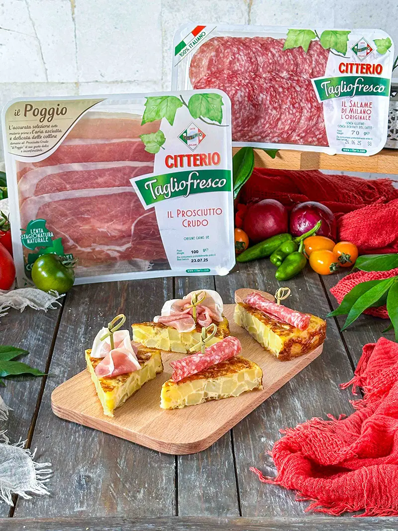Segue poi un classico della tradizione iberica, le tortillas di patate, rivisitate in chiave italiana e arricchite con Salame Milano e Prosciutto Crudo. In questo piatto che in realtà nasce nell’Antica Roma, le uova incontrano le patate a piccoli cubetti e la cipolla bianca stufata, come vuole la ricetta tradizionale, ma è nella farcitura che questa versione si distingue: il Salame Milano dona un tocco deciso e rotondo, mentre il Prosciutto Crudo, aggiunto a fine cottura, esalta la morbidezza e il gusto del piatto. Sono perfette servite calde o tiepide, ideali per un aperitivo ricco e gustoso.
